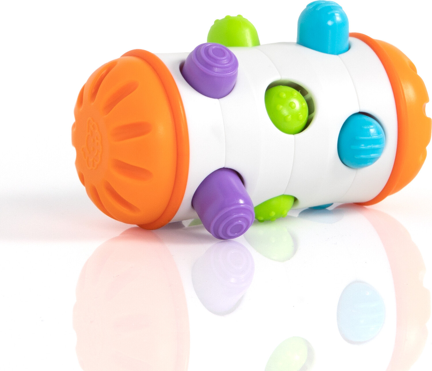 The colorful textured pegs move in and out as the cylinder rolls on its soft silicone tires. It’s amazingly fun to watch. The textures are fascinating for little fingers to feel. The pegs rattle beautifully when you give it a shake. Plus, it’s easy to take anywhere! Sensory learning is on a roll with Rolio.