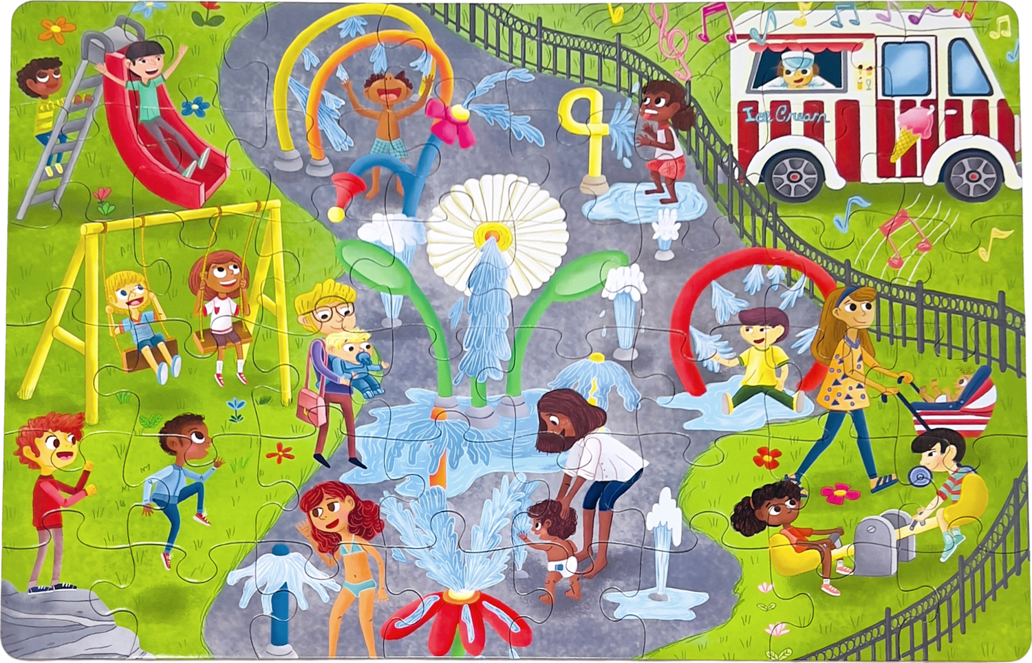 Our best-selling Splash Park design comes as a 2 for 1! This joyfully diverse beginner floor puzzle for kids reflects everyday scenes of a childhood spent at the playground. The other side has a 1 through 10 counting activity with ice cream treats.