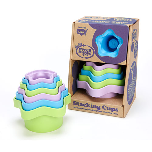 Stacking Cups, by Green Toys Six graduated cups, dozens of possibilities for bath and play time. Scoop and pour water, build towers by turning upside down, or just sort sizes to nest…