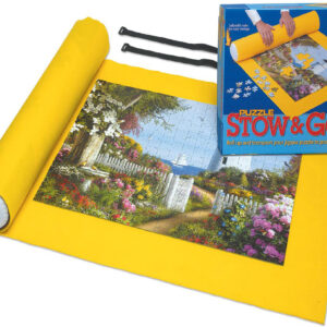 With a mat measuring 46 by 26 inches Puzzle Stow&Go fits Ravensburger puzzles up to 1,500 pieces. Puzzle Stow & Go lets you go virtually anywhere with your favorite puzzle in tow. A bright yellow felt mat for great contrast, an inflatable tube, and two rubber bands make it easy to take puzzles wherever you travel.