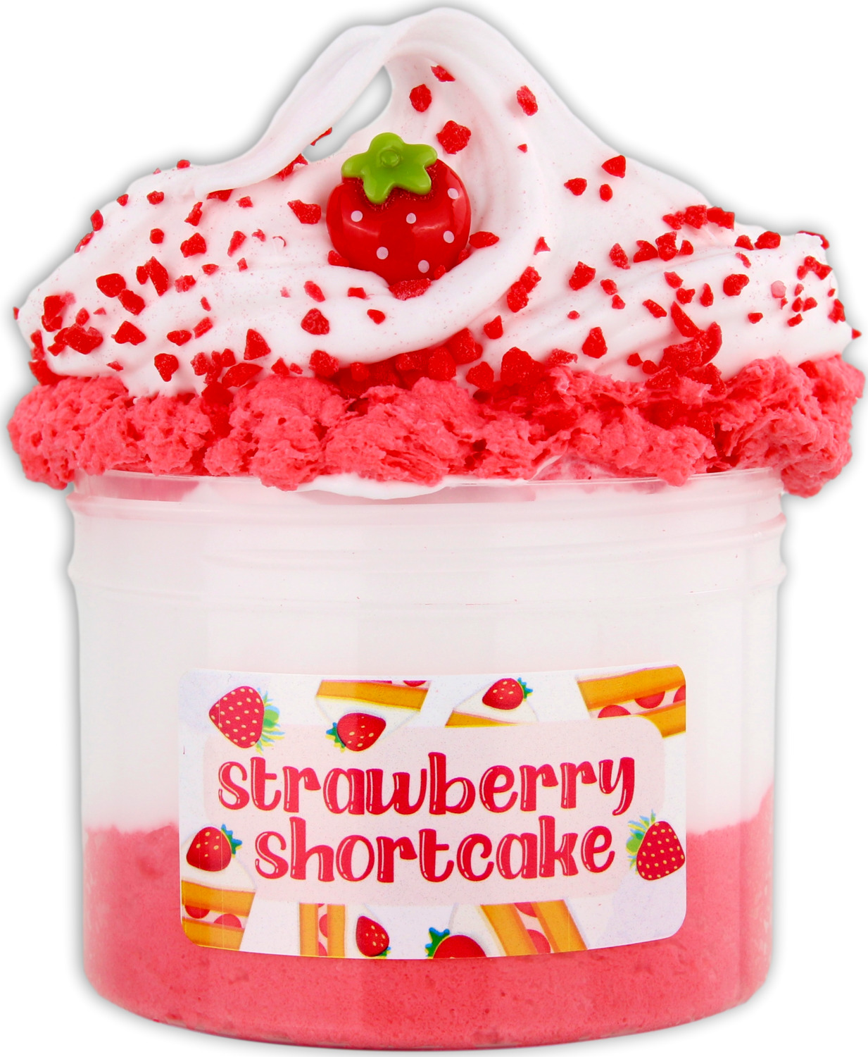 This slime is back to Dope Slimes’ shop — revamped! snow fizz / butter slime hybrid that will remind you of the strawberry shortcake ice cream bars! light red snow fizz paired with a dreamy soft butter slime— scented just like strawberry shortcake & topped with the cutest charm and clay chunks!