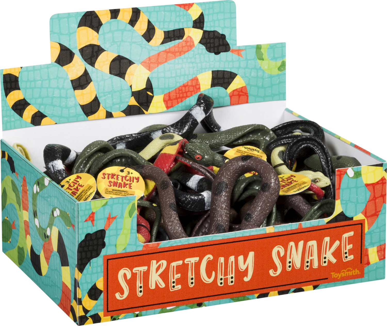 The Stretchy Snake is made of nontoxic, elastic material. Each snake measures 23 inches long. Assorted colors. Get an assortment of 24 packed inside a red and turquoise display box.