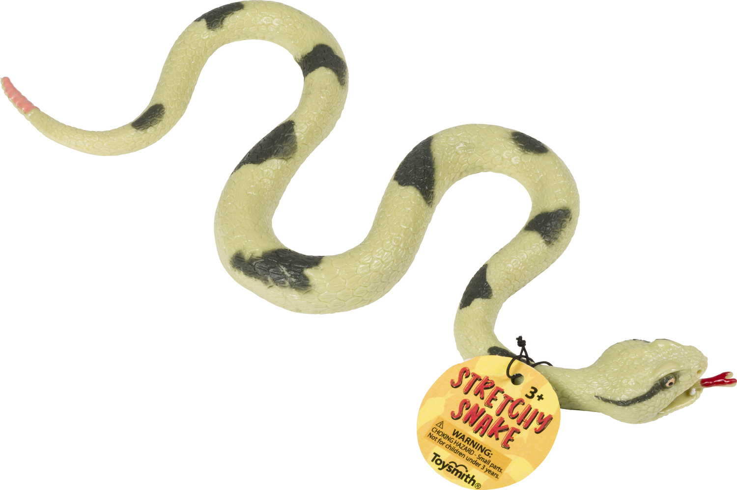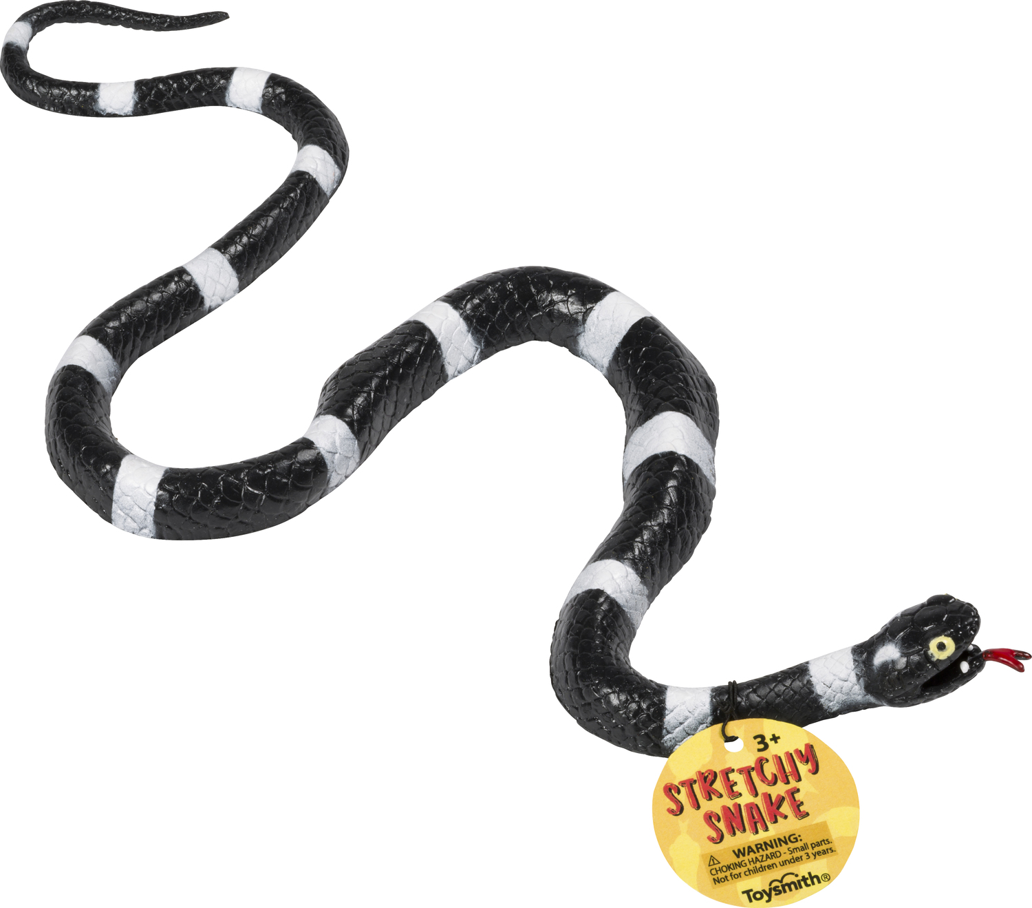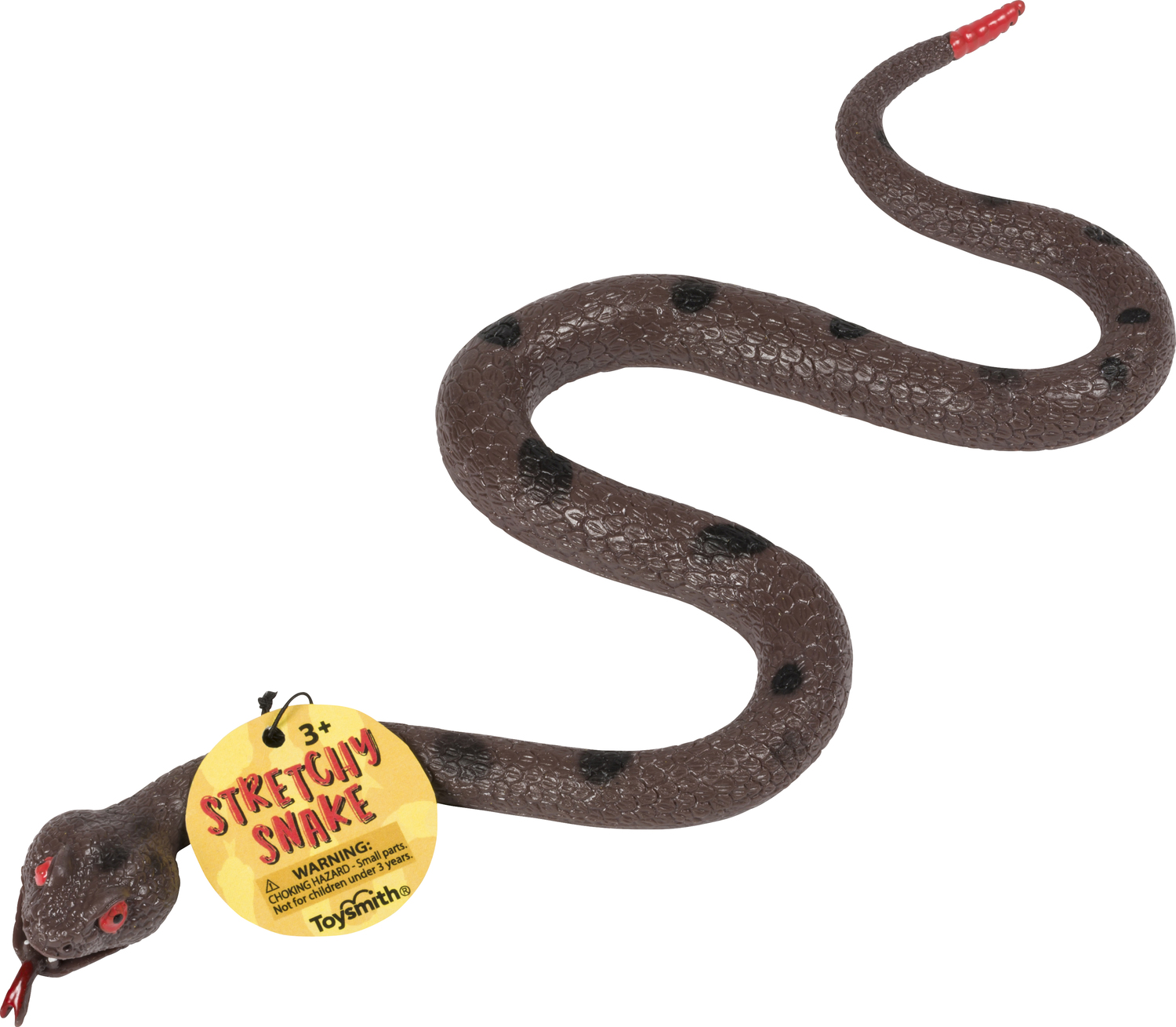Available in an assortment of different colors, the Toysmith Stretchy Snake is exquisitely detailed and fun to play with. Made of nontoxic, elastic material each snake measures 23 inches long and can be stretched, wrapped around objects, or curled up tight. Styles include spots or stripe and are designed with 3 or more colors. Some snakes have open mouths with fangs and pink tongues, while others have closed mouths and protruding tongues. Colors vary but may include red, yellow, black, white, green, gray, and brown. Get an assortment of 24 packed inside a red and turquoise display box.