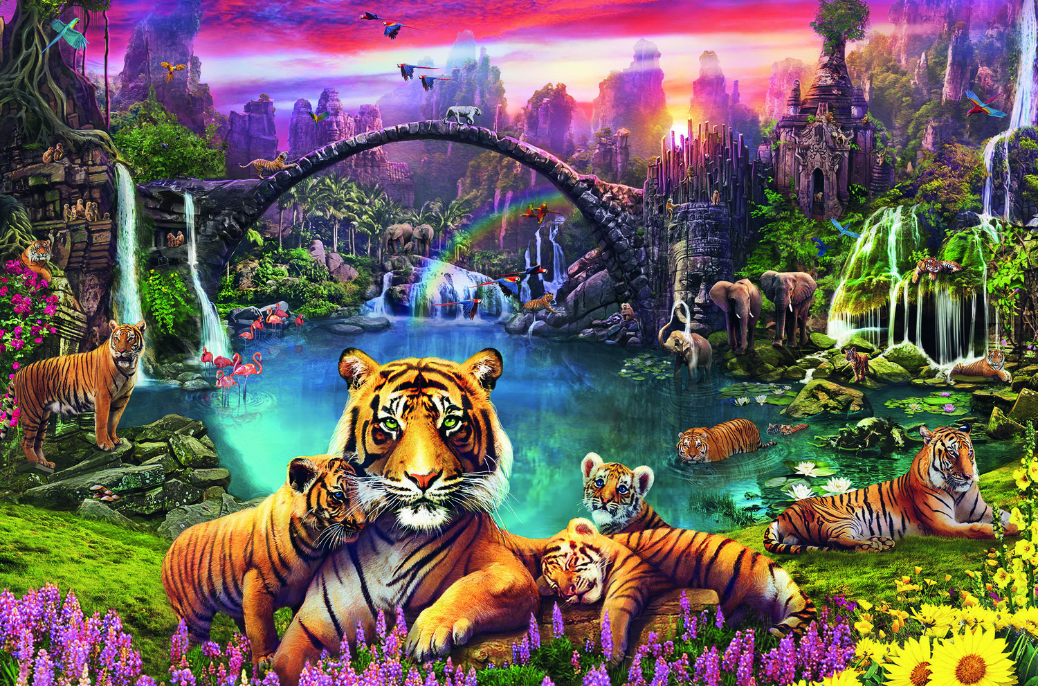 Nestled amid ancient ruins, this tropical paradise is home to a streak of tigers, all of whom seem to be quite calm and content. With waterfalls filling their crystal-clear pool and a lush variety of flora and fauna surrounding them, tigers young and old have found their very own utopia! This meticulously rendered illustration features frolicking elephants, soaring Scarlet Macaw parrots, and much more to explore. A fun challenge for all!