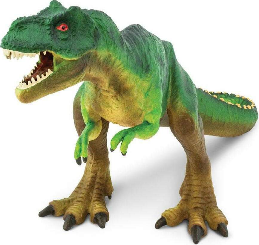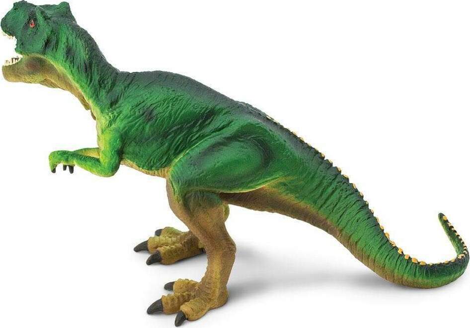 • Characteristics: In real life, Tyrannosaurus, was large (at least 40 feet long), stout and muscular (5-6 metric tons), but Safari Limited’s Tyrannosaurus Rex figure is much smaller. It ran on its thick hind legs. Its huge jaws contained lots of sharp, six inch long teeth. Each tooth had a serrated blade on both the front and back edges that could easily have cut through any prey. Its front limbs were tiny and its hands had only two little fingers. Safari Limited don’t know what these fingers were for, but they were far too small and weak to walk on, fight off other dinosaurs, or grasp prey.