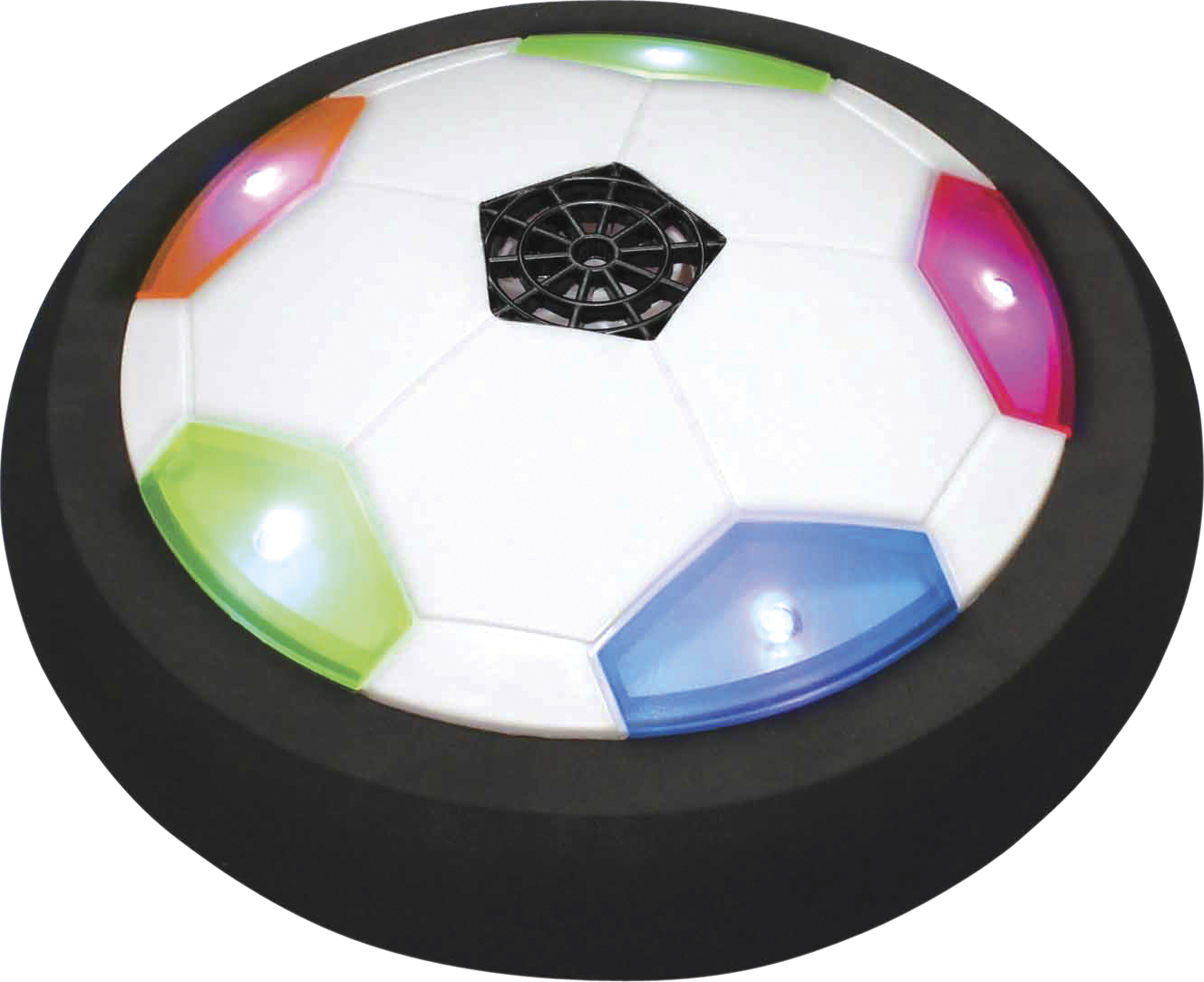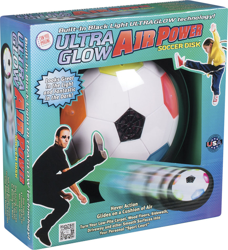 This futuristic soccer disk uses the power of air to glide over surfaces with just a push or kick. It hovers on a cushion of air for friction-free travel. Give it a kick and watch it glide. Rubber edges protect furniture, walls, and shins and allow for great rebounding. Easily travels over any smooth surface, so you can turn your carpet, wood floors, sidewalk, or driveway into a sport court. Built-in black light makes nighttime play possible.