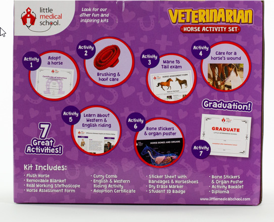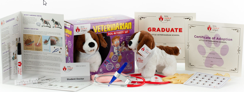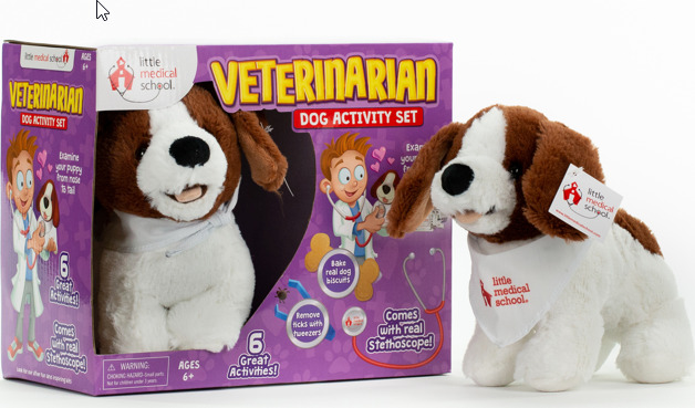 Package ContentsPremium plush puppy Real stethoscope Student doctor ID badge Veterinarian workbook Activity sheets Reusable marker Tape measure Tweezers Latex-free gloves Healthy dog treat recipe card Bone-shaped cookie cutter Modeling dough Tick stickers Veterinarian diploma Adoption certificate